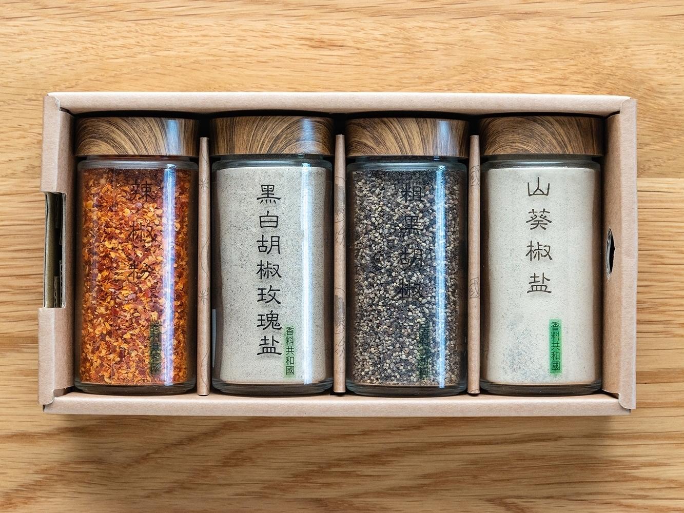 品名:經典風味禮盒/內容物:辣椒粉、黑白胡椒玫瑰鹽、粗黑胡椒、山葵椒鹽