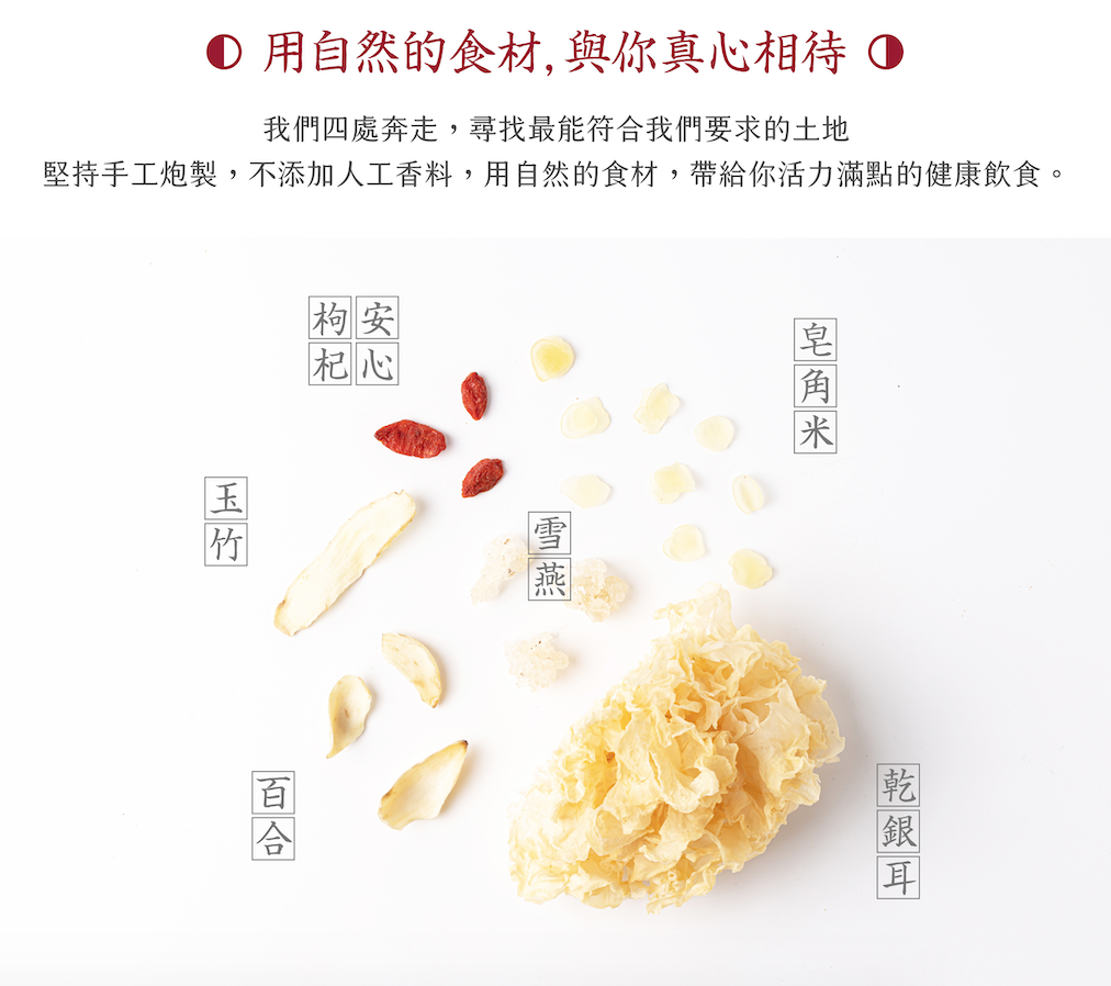 ⑤ 茯苓|嚴選切片白色細膩的茯苓,熬煮後黏牙可口。含有聚醣與蛋白質, 幫助調整體質。