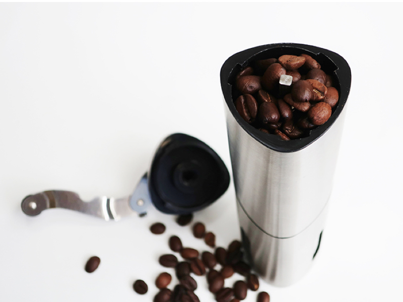 上蓋可直接打開,進豆方便。上下結合皆為卡榫鎖定設計,輕鬆開合,也較為穩固。手柄上鎖,搖動時不會滑脫,粉槽雙層設計,可隔開手溫,保留咖啡香味。