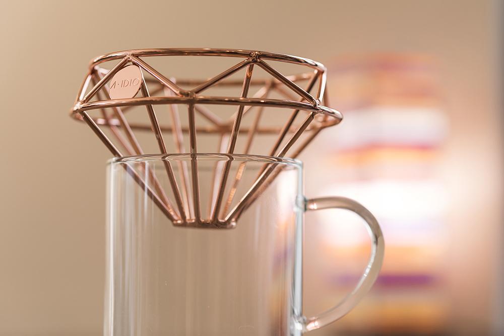 A-IDIO 鑽石型咖啡濾杯,獨創雙層支架濾杯,外層代替傳統底座,可架在任何咖啡壺及高杯之上;內層可置放濾紙,咖啡萃取液可直接沿著濾紙緩慢流下。
