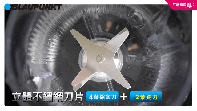 以食用級 304 不鏽鋼製作,4 葉鋸齒刀+2 葉鈍刀的立體刀刃組,調理後可讓食材口感細緻綿密。