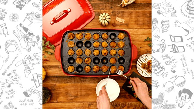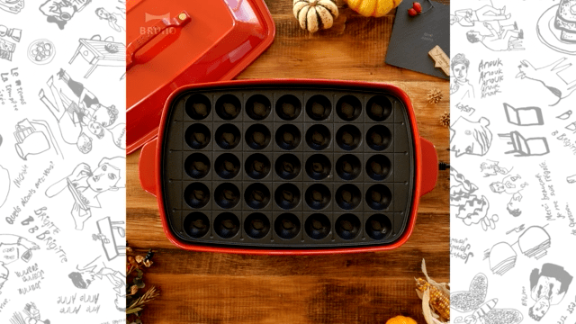 BRUNO 多功能電烤盤除了平面烤盤外,還有附加超方便章魚燒烤盤,一盤共三十五格,只要準備簡單麵糊、章魚塊和任何喜歡的食材,就能料理好玩又好吃的章魚燒囉!