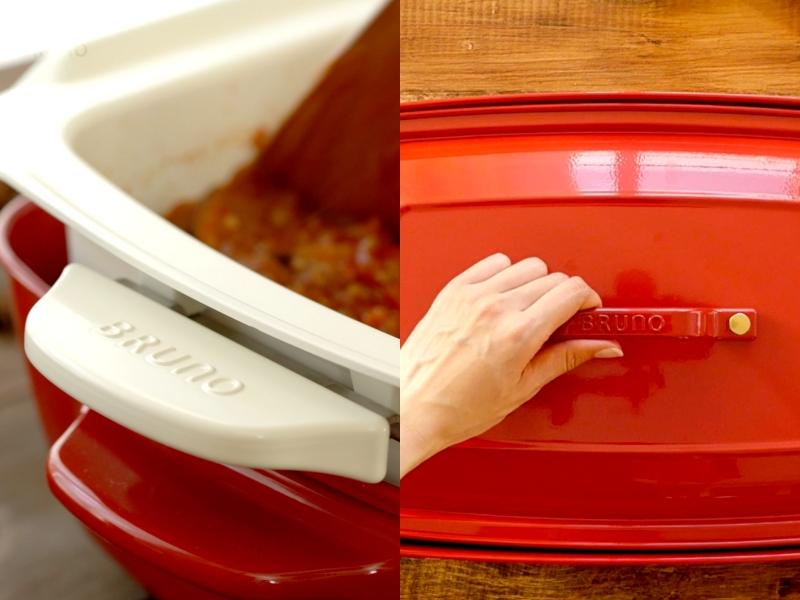 電烤盤上蓋弓形設計輕巧好拿,且印有 BRUNO 品牌字樣,時尚美型,可依料理需求使用上蓋。左右兩側的耳朵把手設計方便移動、端運烤盤。