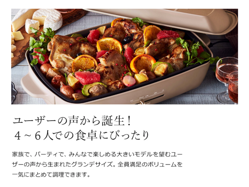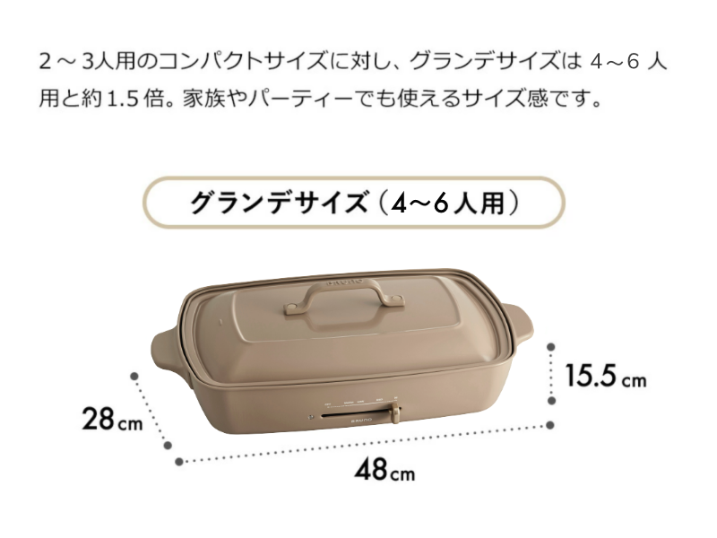 功能不變,容量加大升級至4~6人,適合與家人朋友一起相聚享用美食。煎烤炒煮都適合;一機抵多機,不論是煎餃、牛排或西班牙燉飯都難不倒。附有兩種烤盤,除了做一般焗烤、燉菜料理,還可以煎牛排、漢堡排,以及與家人朋友一起製作章魚燒點心。