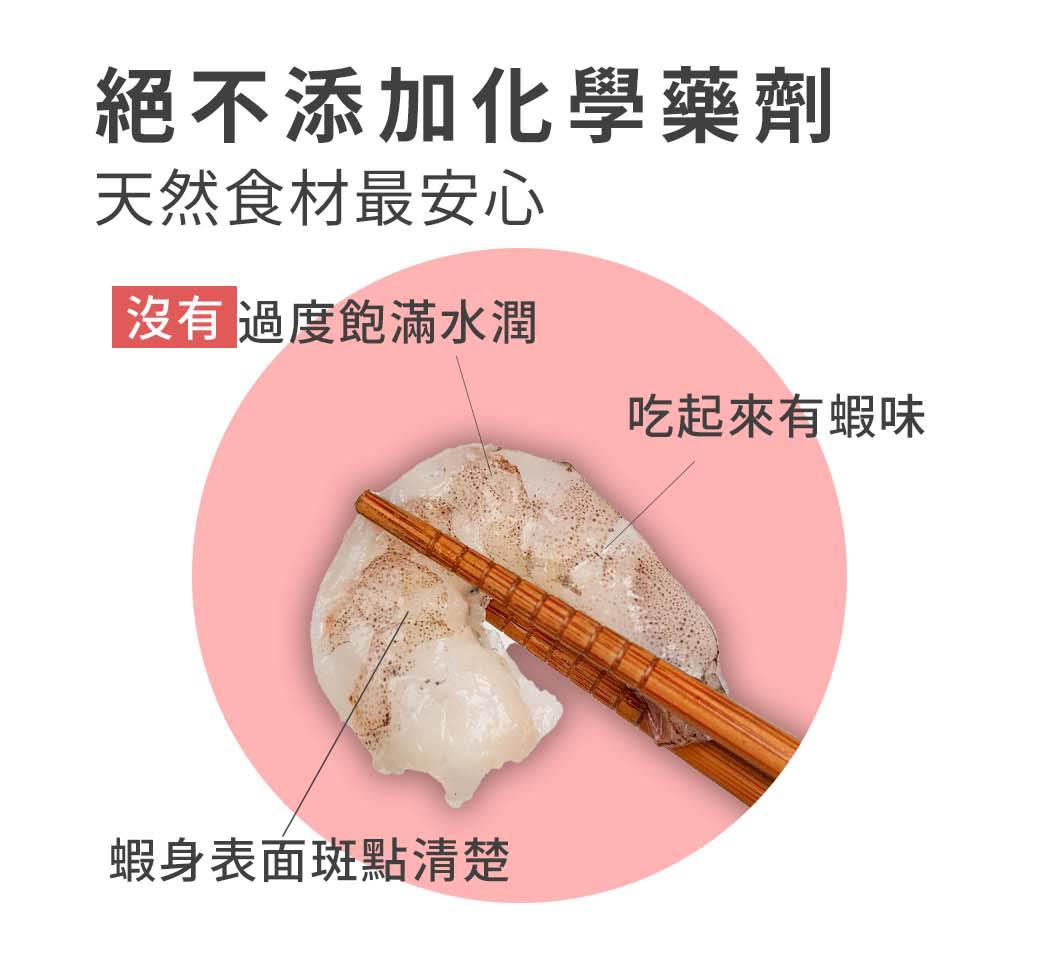 無添加任何藥劑的蝦子,吃得出蝦味、不會有果凍般脆口的口感、天然扎實Q彈!