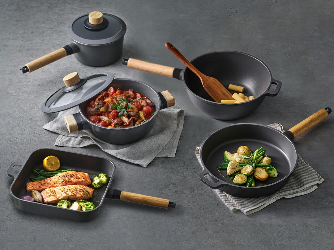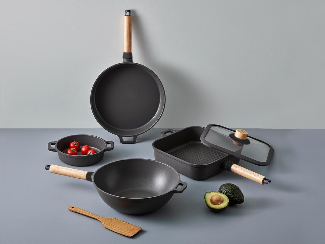 BOSQUE 鍋具組共有五種鍋具,包含平底煎鍋、炒鍋、方型煎盤、單柄湯鍋、雙耳燉鍋,結合了鑄鋁材質的輕量特性、革新塗層技術帶來的不沾效果、通過百萬次以上的鐵鏟來回抗刮測試、以及不含重金屬、氟化物等檢測,又省去傳統養鍋的繁瑣過程;讓你輕鬆變身料理大師,煎煮炒炸都不是問題!
