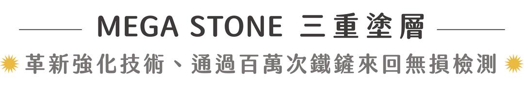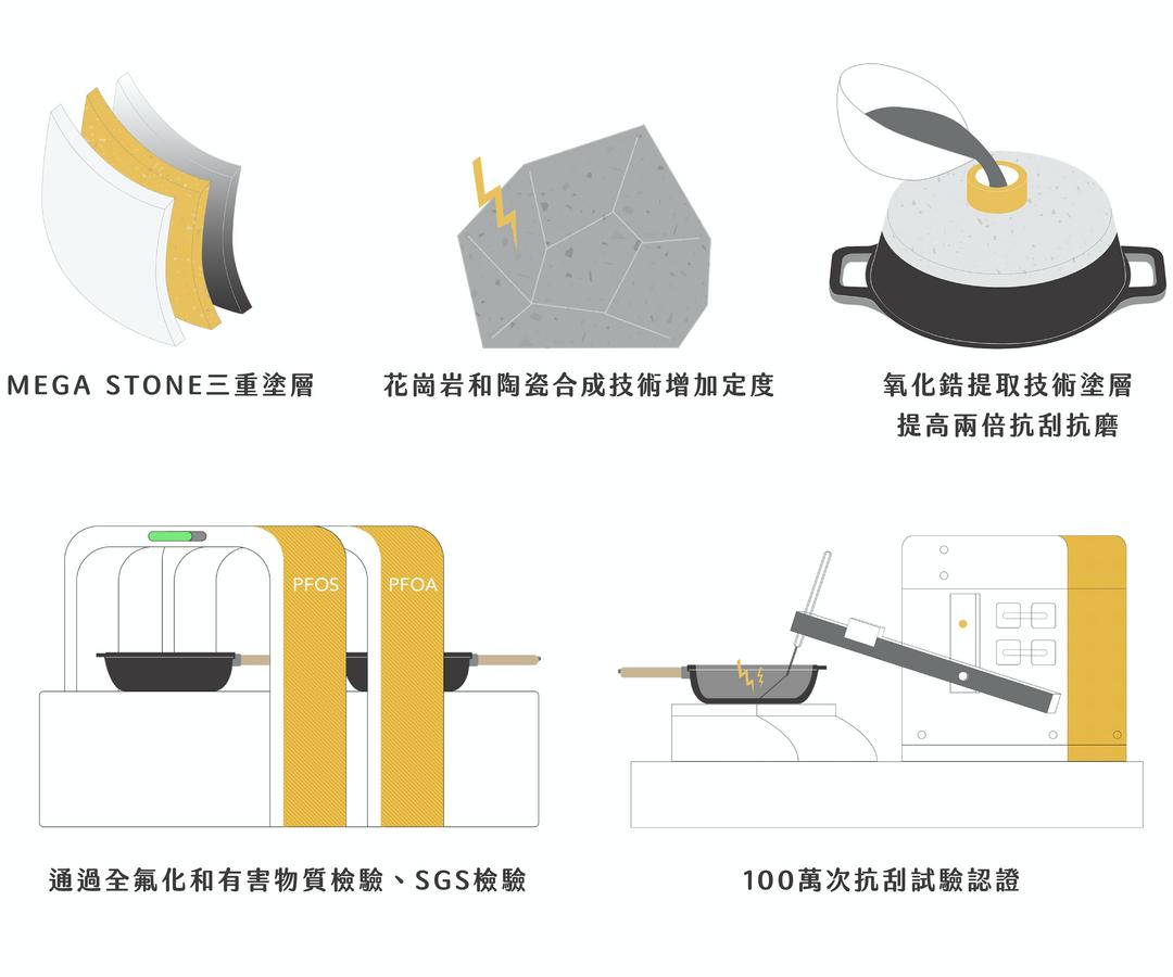 【平底煎鍋、炒鍋、方型煎盤】採用 MEGA STONE 三重塗層技術,比起他牌廚具,大幅增加耐磨與耐腐蝕性,更能扛住 380°C 超高溫。無論是大火持續翻炒、或是調理蝦蟹貝類等硬殼食材,都不用擔心塗層剝落吃下肚的問題。