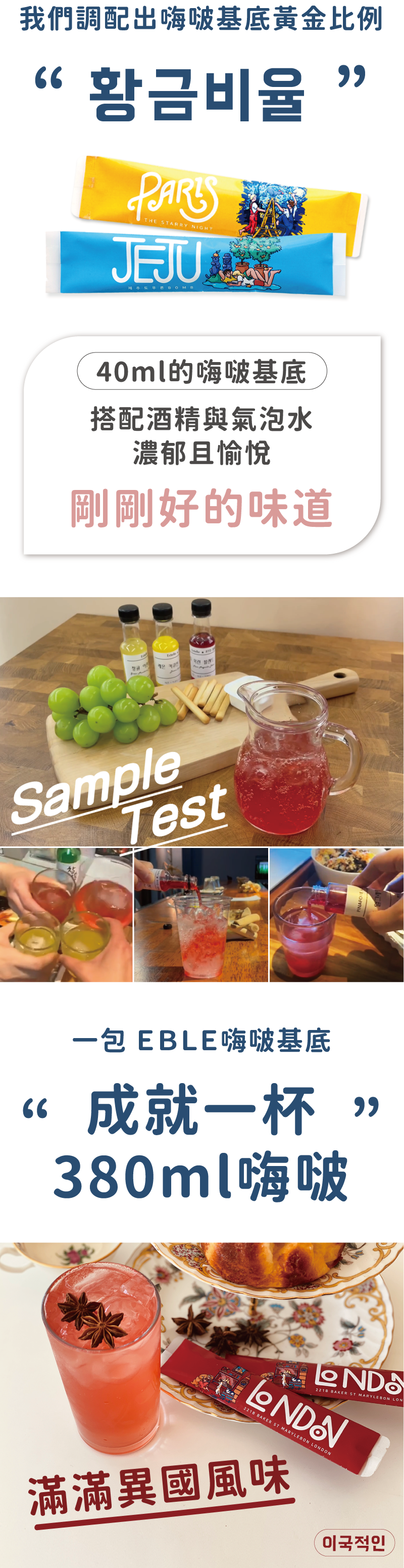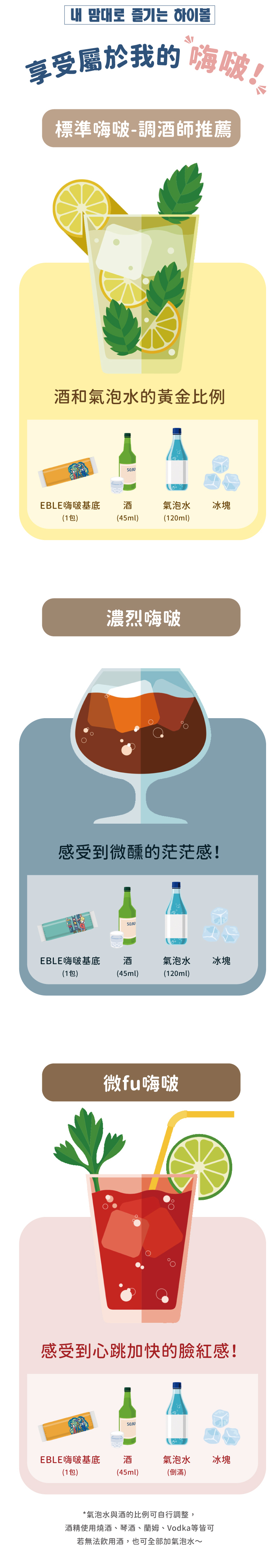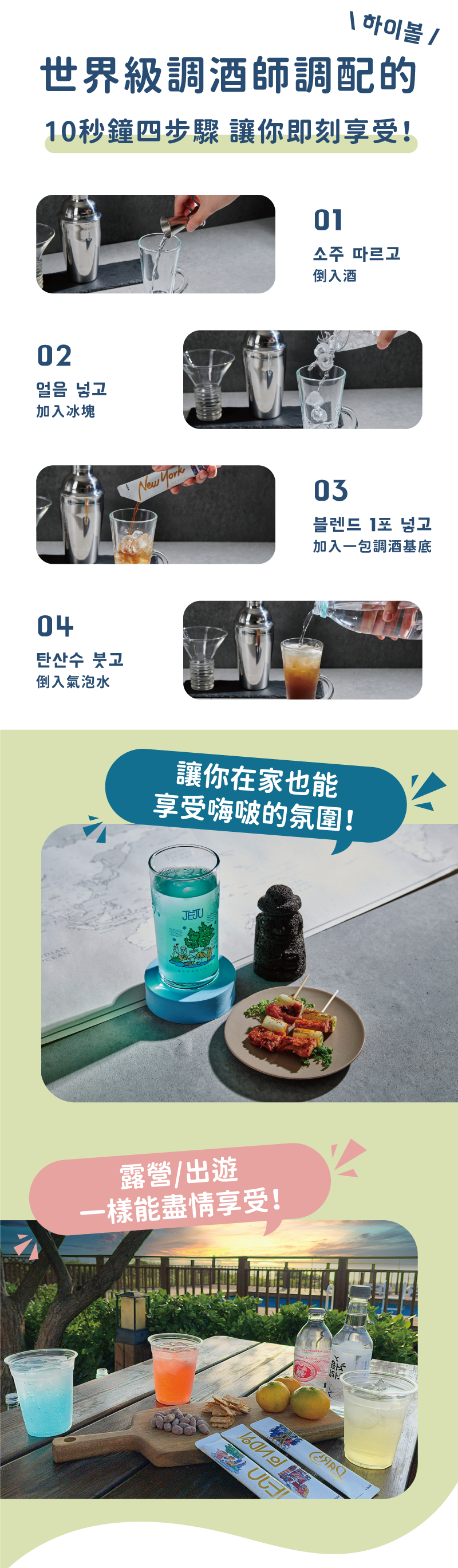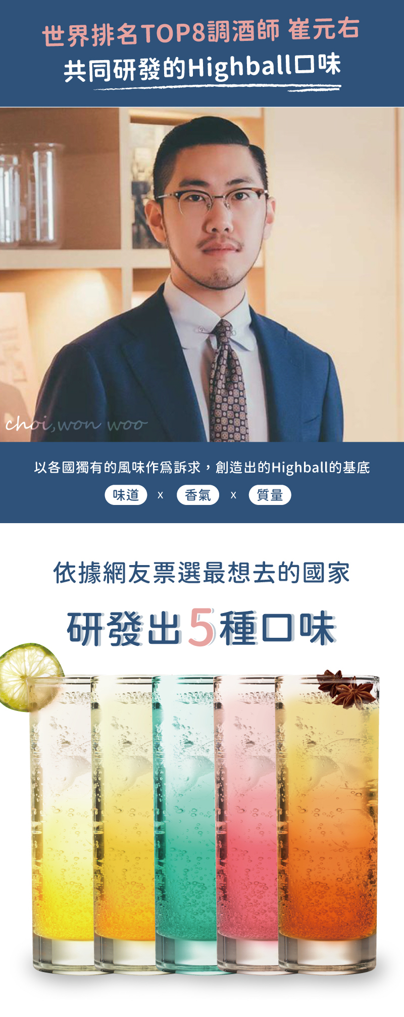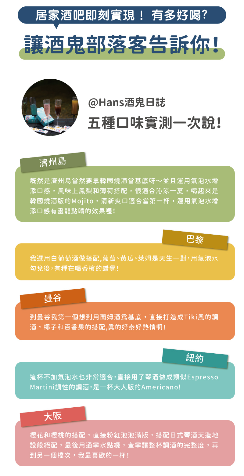 以各國的文化元素作為訴求,創造出可調成 Highball 的基底,由世界級調酒師共同研發的五種口味,方便攜帶,剛剛好的 40ml 容量,只要 10 秒即可調配完成,輕鬆感受滿滿的異國風味!