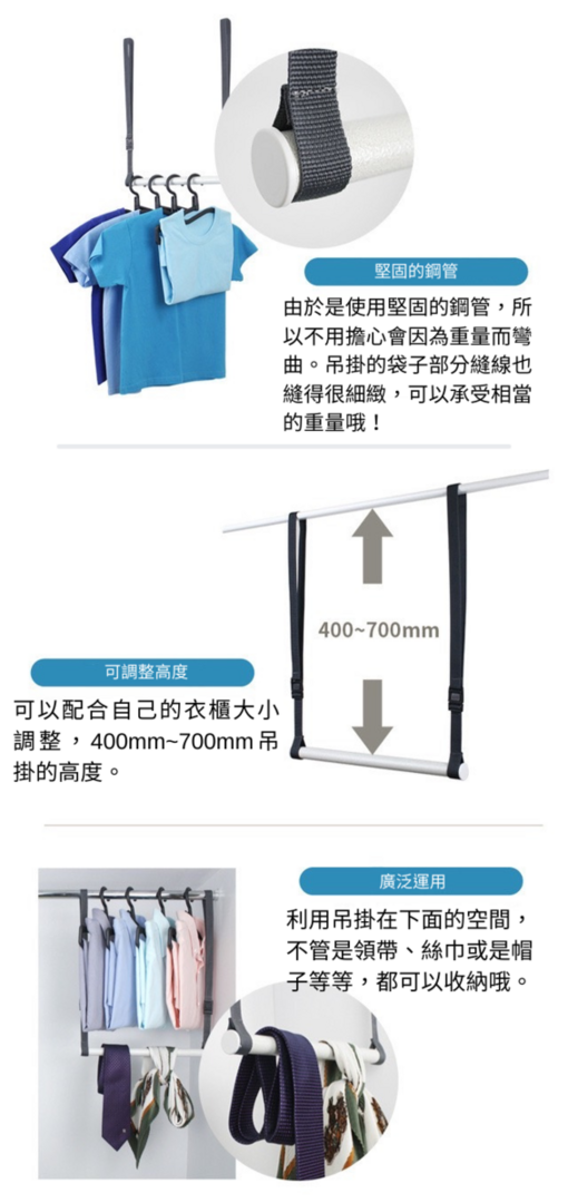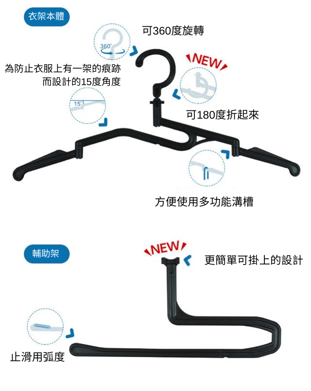 多項貼心功能,360 度旋轉與 180 度摺疊收納,可直接將衣服連同衣架收納至行李箱,即可外出攜帶使用。