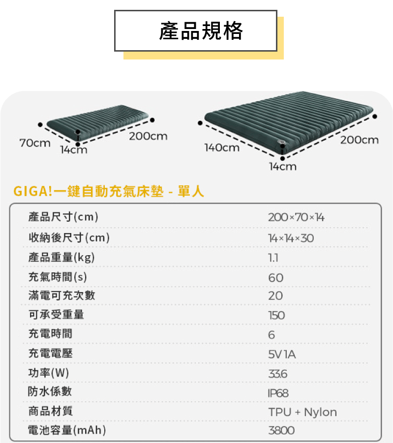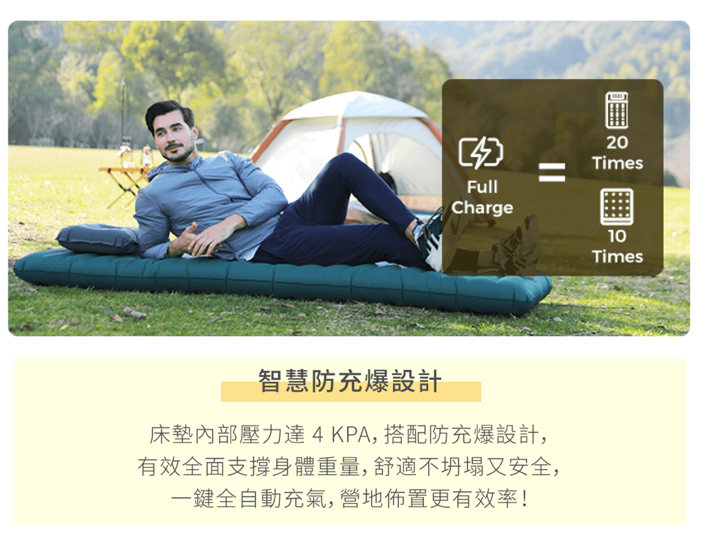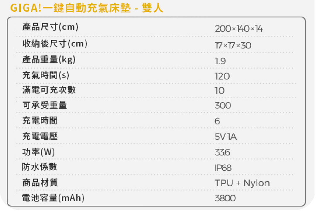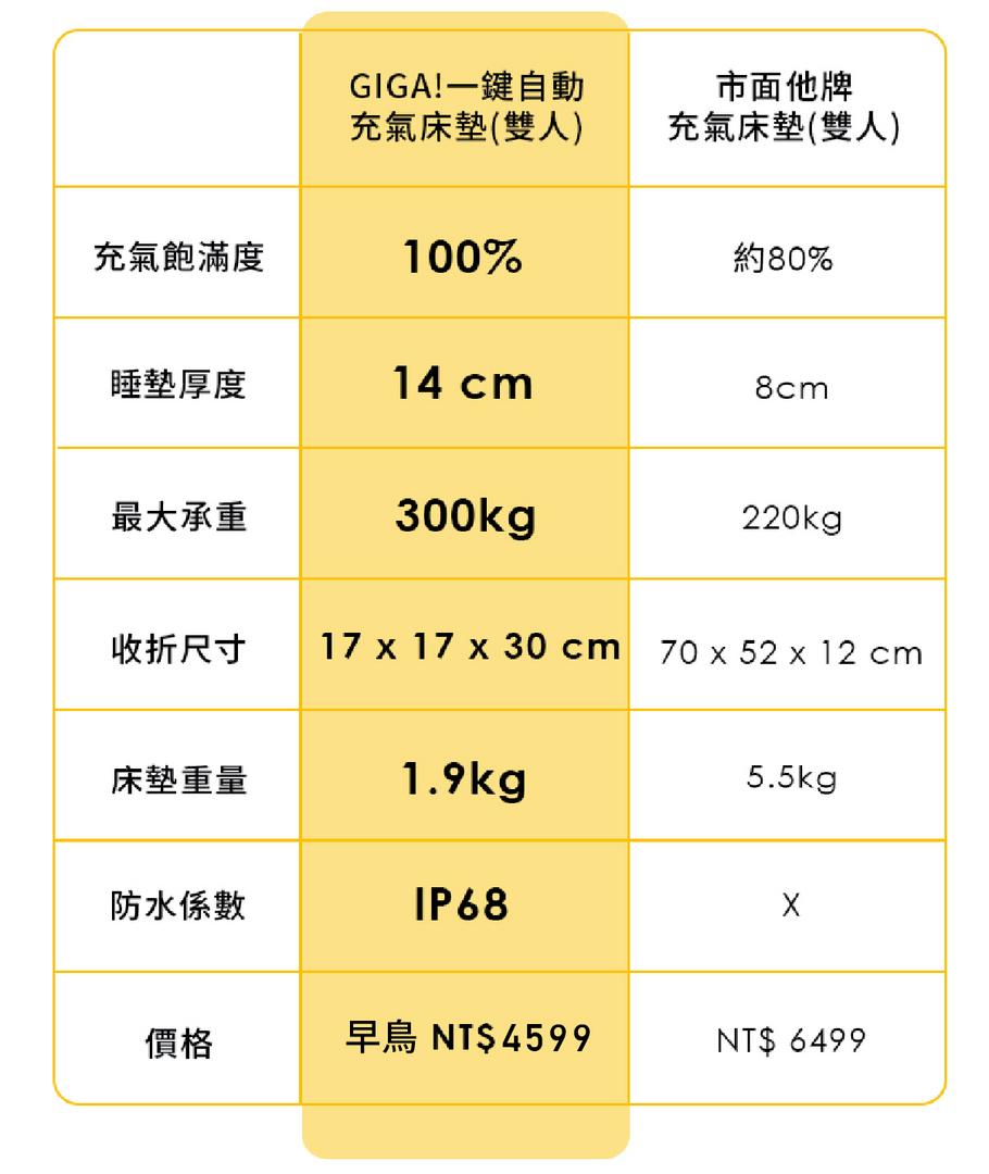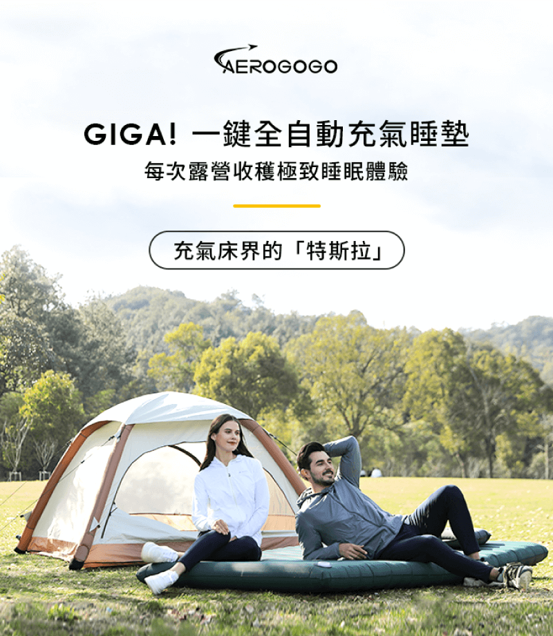 野外露營總是睡不好?那是你沒睡過 GIGA! 充氣床界的特斯拉!全自動充氣、高 支撐、防水、好收納!就像躺在你家床墊上一樣舒適,讓你輕鬆實現睡眠自由,在山野中恣意存放你的好夢。