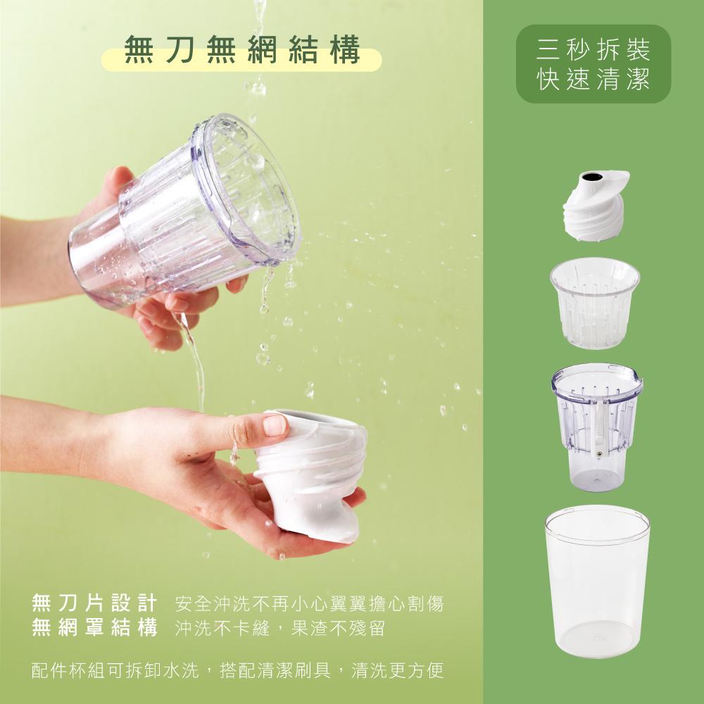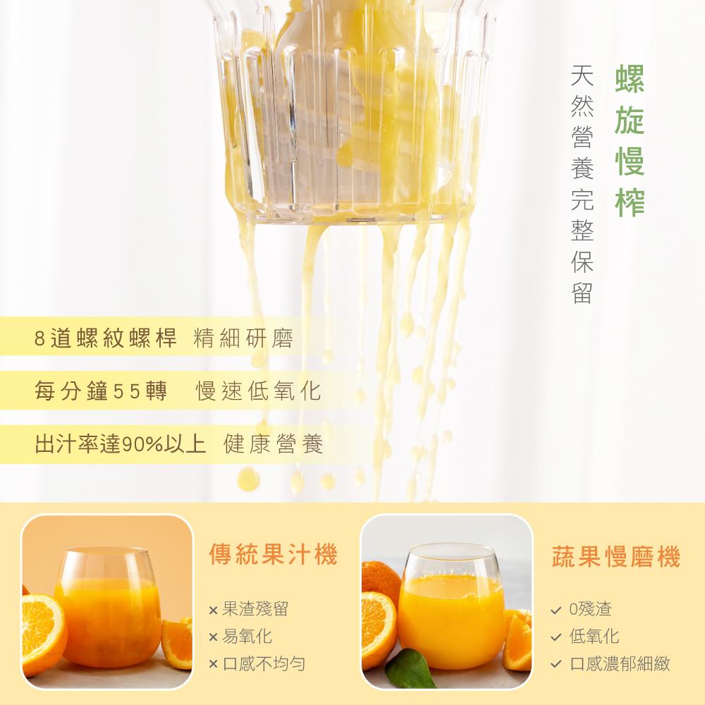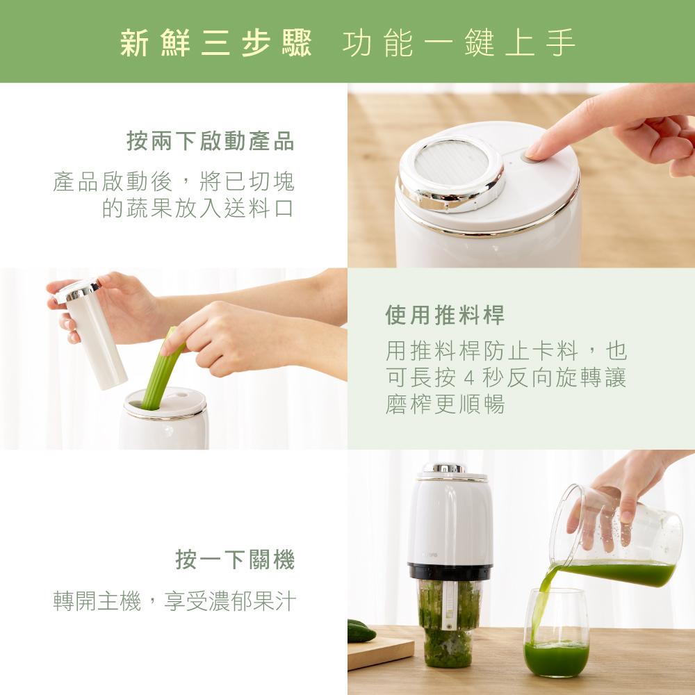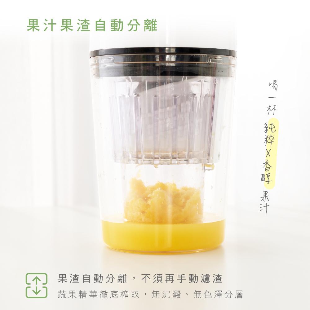 慢磨果汁隨時現榨,口感細緻、低氧化,保留完整營養,不必再手動過濾果渣;適合現代人忙碌生活,無線輕巧,無刀無網罩,配件均可拆洗,簡單好清潔!