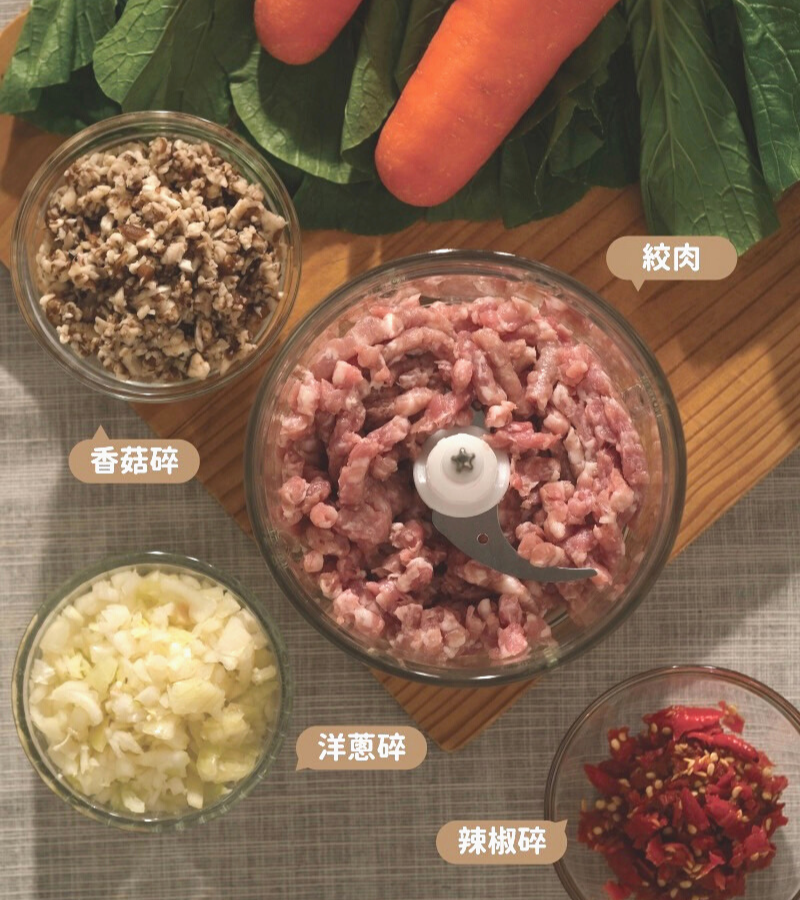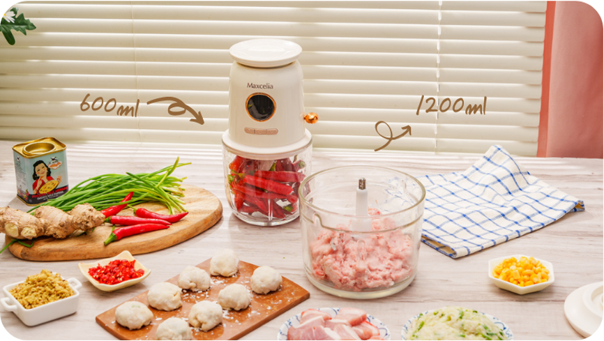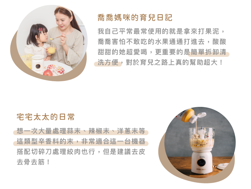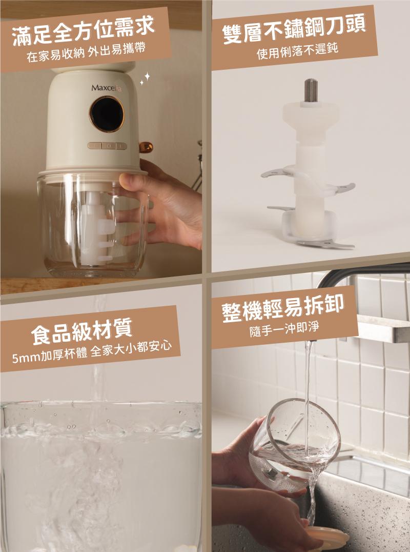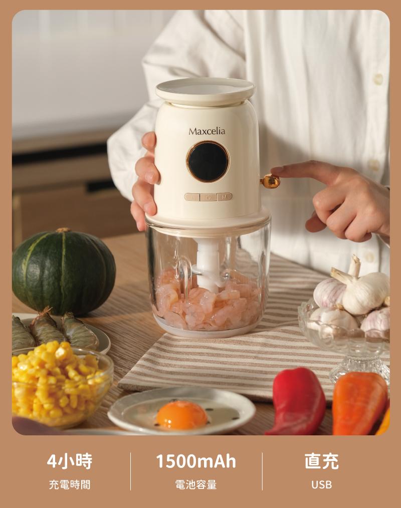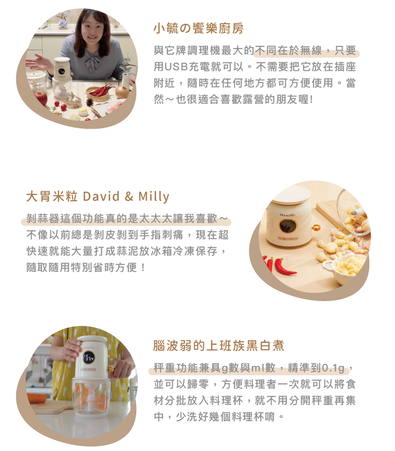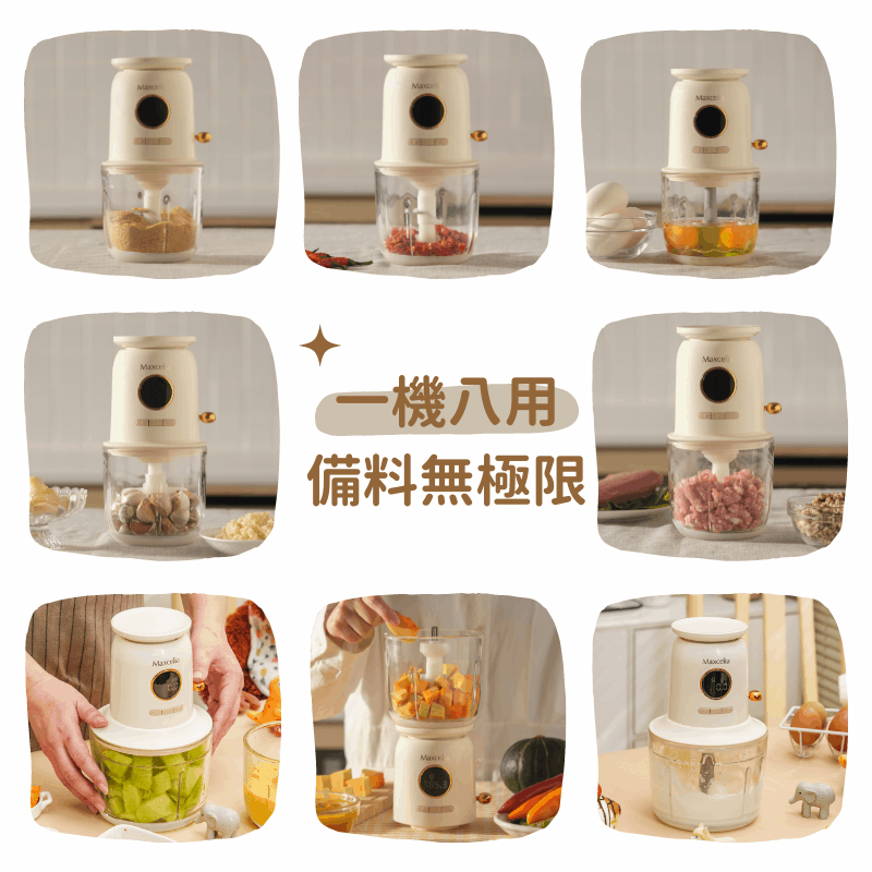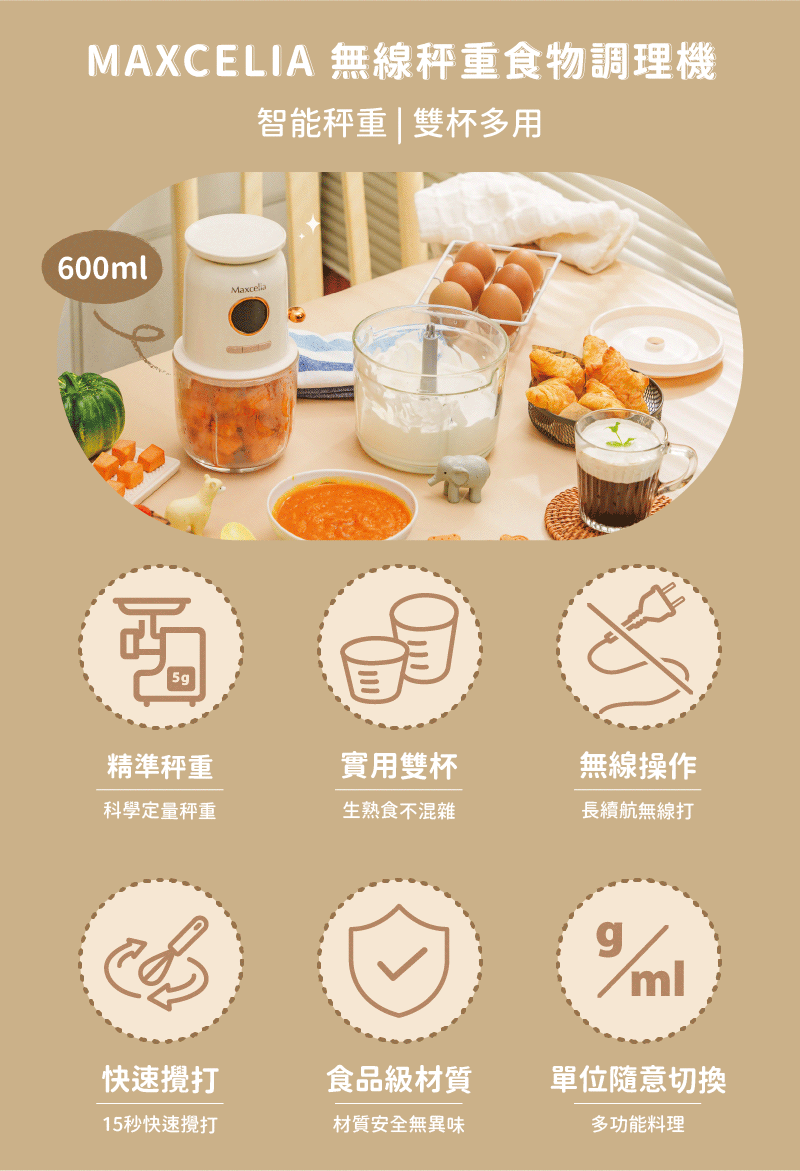 無線秤重食物調理機雙杯多用,生熟食分開處理,隨附四款刀頭,可剝蒜、絞肉、攪拌、打蛋、打發奶油、研磨果泥、副食品等,各種需求一台搞定;貼心智能秤重,無線設計使用不受限,輕鬆省下一半事前備料時間!