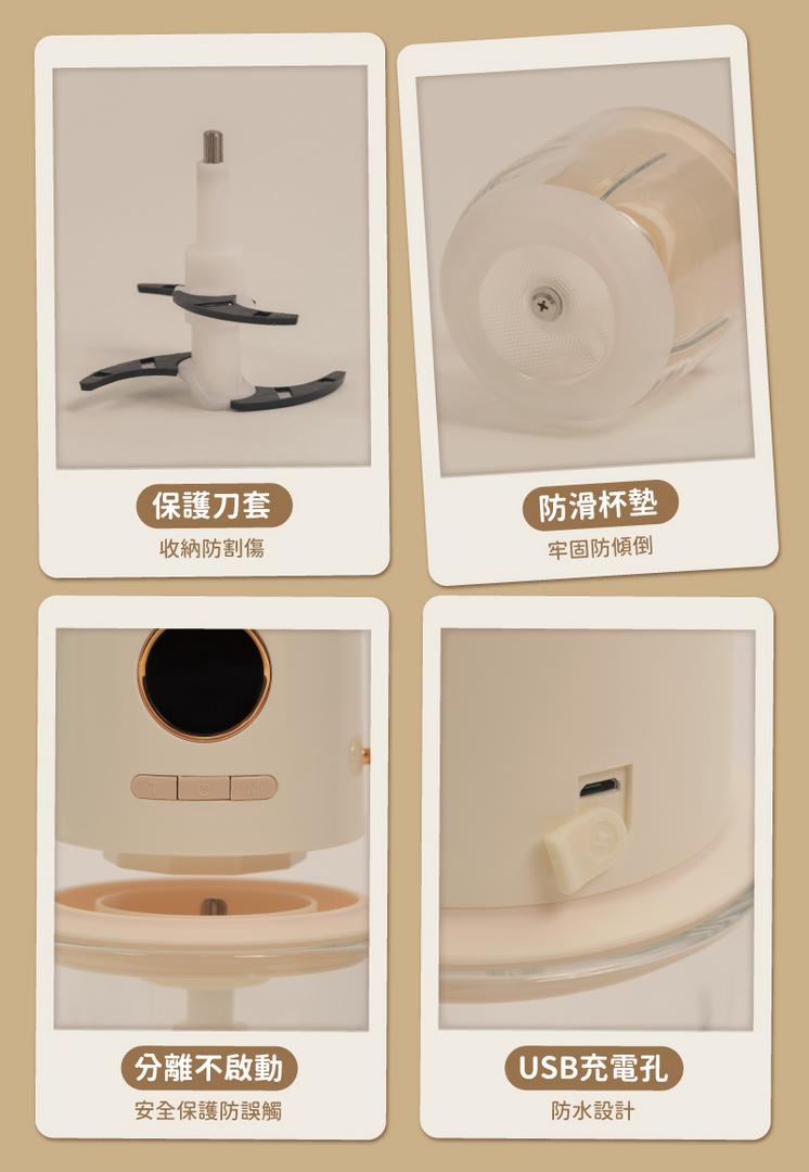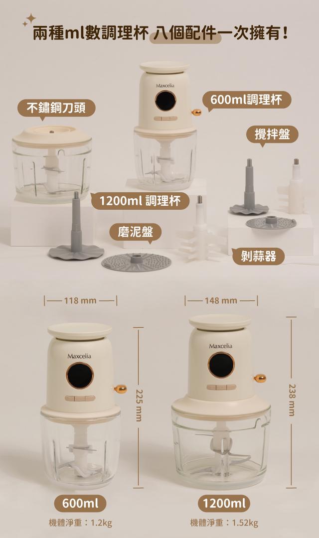 內容物:主機+600ml 玻璃調理杯+1200ml 玻璃調理杯+不鏽鋼刀頭x2+剝蒜器x2+攪拌盤x2+磨泥盤x2+刮刀+USB充電線