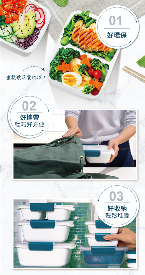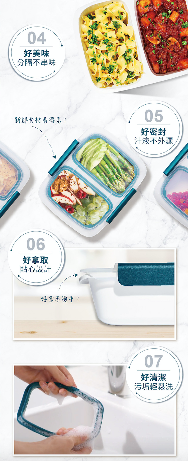 適合盛裝食物,無論是備料食材,剩食儲存或是外出餐食,完全密封保鮮盒都是最佳選擇。好拆洗的矽膠條與雙耳扣,完美密封不漏湯汁,一體式手柄設計,不必擔心微波加熱後燙手,不含 BPA 可安心使用。