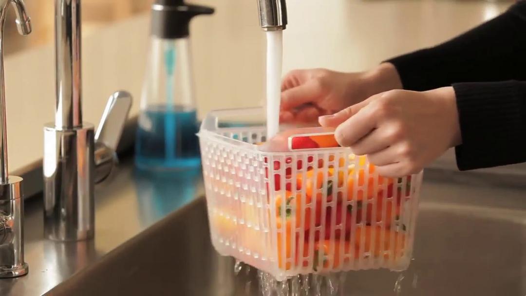 保鮮盒內置濾籃設計,從冰箱取出冷藏的青菜時,連同濾籃一起取出,立馬就能輕鬆洗菜,更加方便!