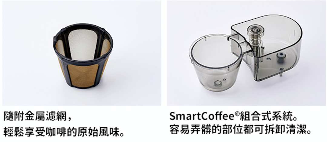 使用 SmartCoffee 組合式系統,整合了濾網支架與水槽,方便拆卸清洗。