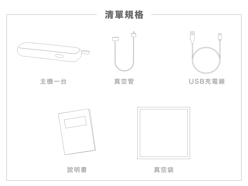 內容物:真空保鮮機、USB-C 充電線、使用說明書、真空專用外接管、15x25cm真空保鮮袋x5