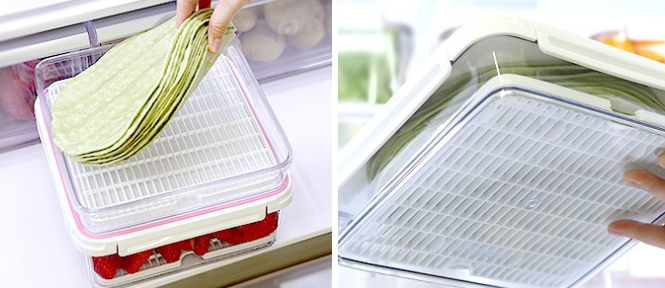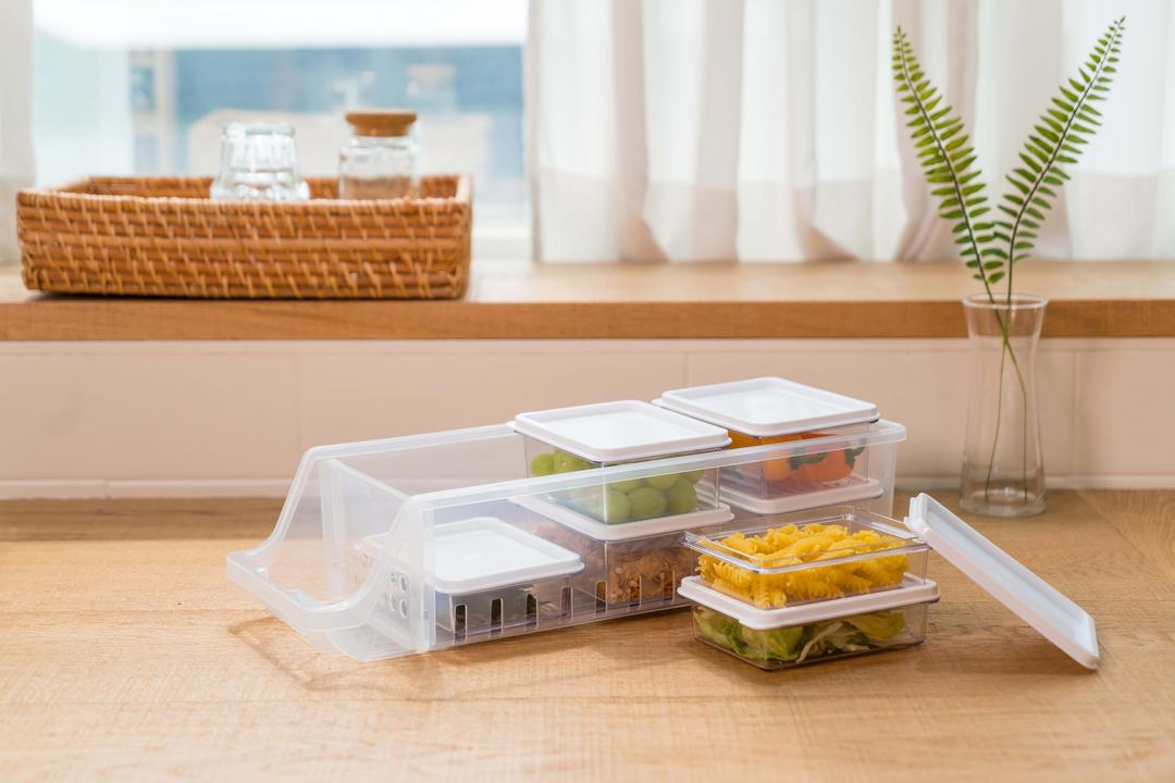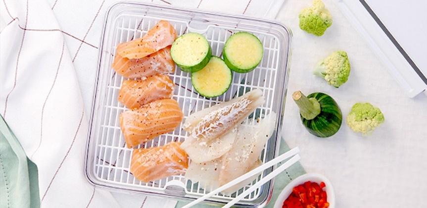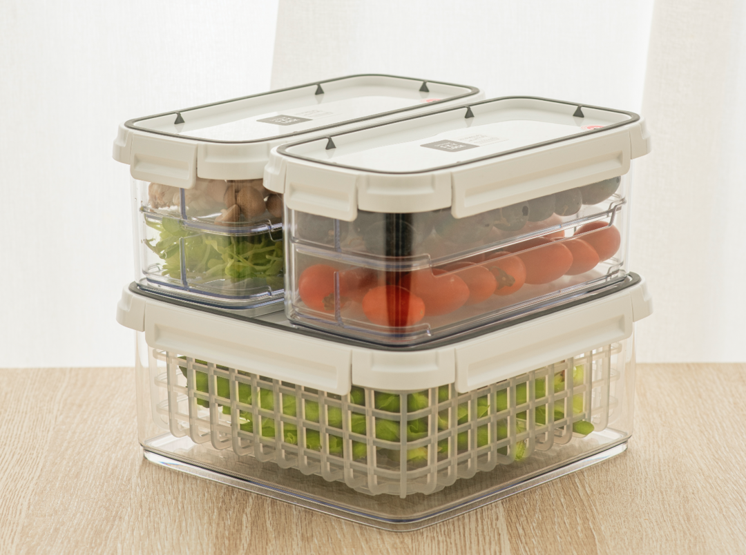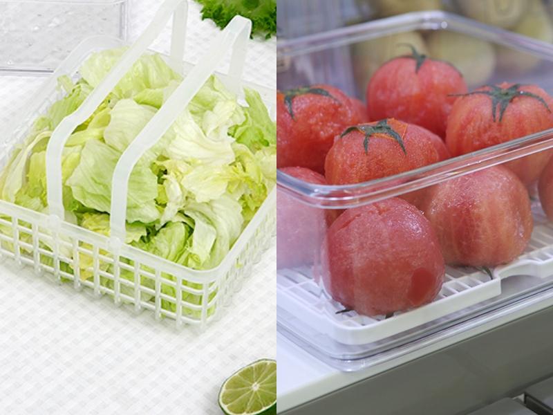 附有格狀瀝水提籃,讓每天的洗菜備料更加省時省力,過年享用圍爐火鍋時也能將完整食材直接端上桌;提籃底的小腳設計能將食材與保鮮盒底的水分隔開,讓蔬菜長時間冰在冰箱也不會變得濕軟。
