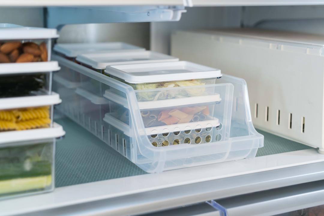抽屜式的收納盒,一體成形的手把設計,能迅速省力的取用;底部有四角防滑墊,拉動抽屜時也能穩固安全的定位在冰箱層板上。