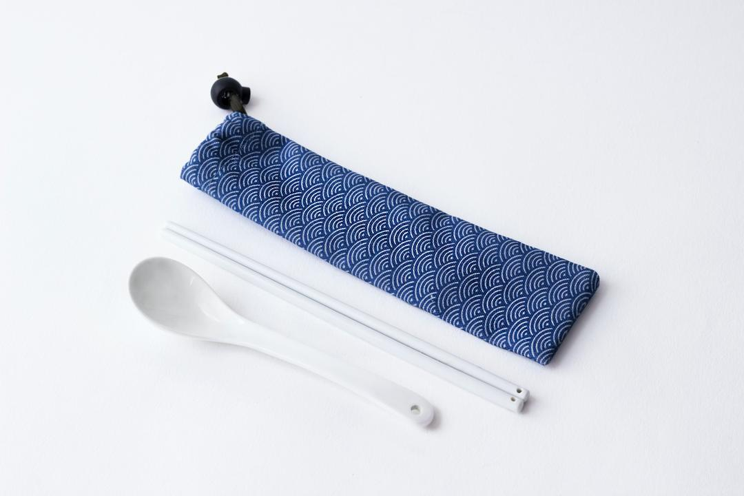 陶瓷餐具組以 100% 硬白瓷製作而成,附有收納袋,湯匙、筷子一組兩入。