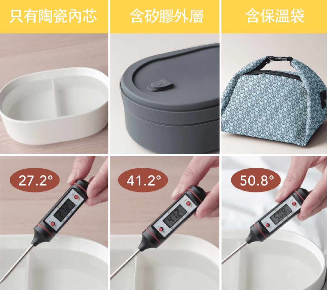 2 小時後進行實測,使用三層不同材質組合,強化絕緣效果,保留便當風味,讓每一口都是理想溫度。