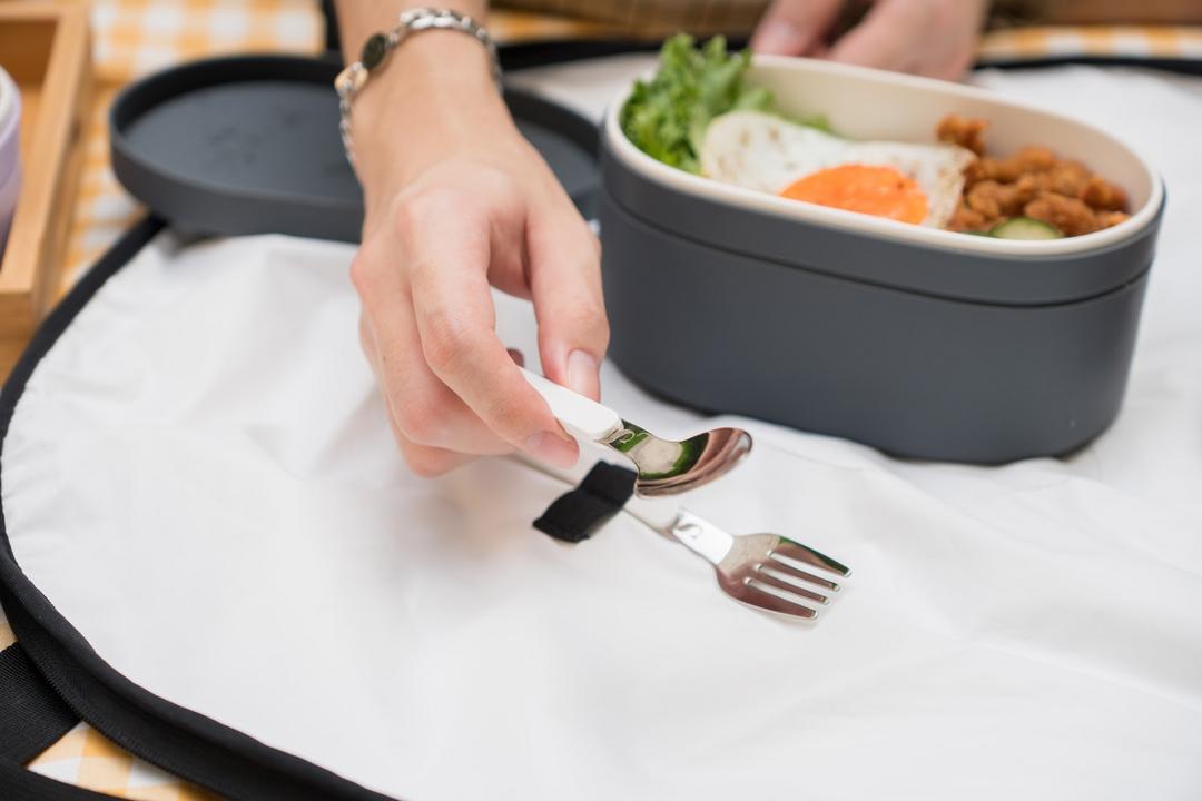 以 304 不鏽鋼材質製作而成,不易生鏽、簡潔乾淨,湯匙、叉子一組兩入,可收納於多功能保溫袋中。