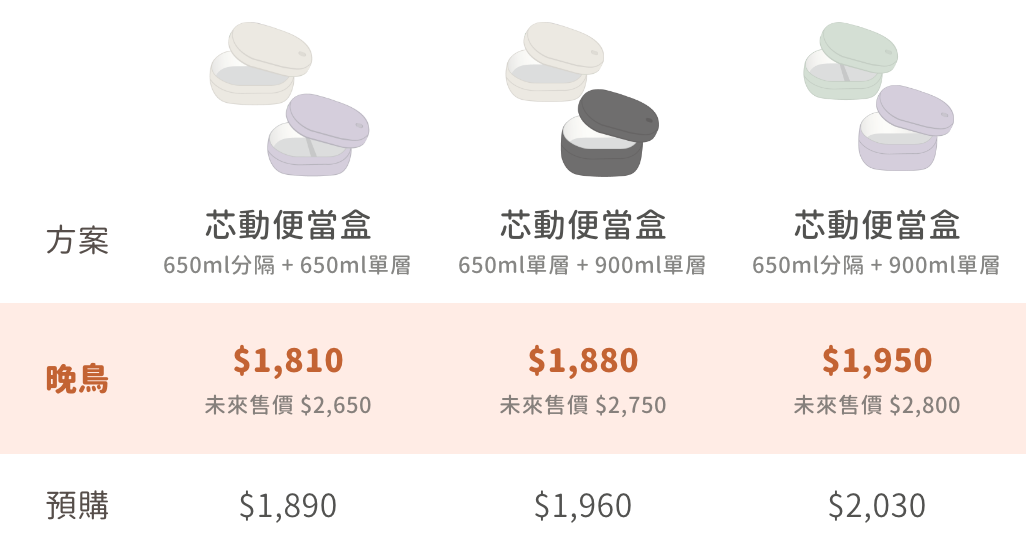 芯動便當盒以一餐最佳容量設計,讓您吃飽但不吃撐,三種容量與規格,可隨自己喜好與需求搭配選擇。