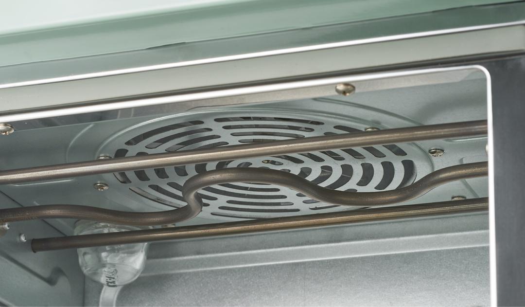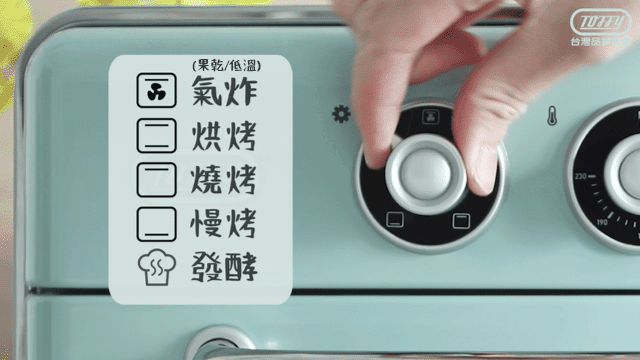 採簡約旋鈕設計,烘烤溫度範圍 40℃、60~230℃,定時可達 60 分鐘;上下燈管分開加熱,搭配低、高速風扇功能,即可擁有氣炸、烘烤、燒烤、慢烤、發酵等模式。