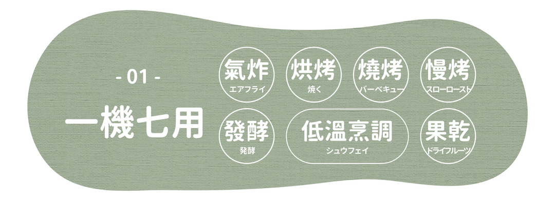一機多用途,可烹煮低溫烹煮、烘焙果乾、優格製作、酥脆炸物、燒烤串燒、麵包甜點等,輕鬆完成各種日常料理!