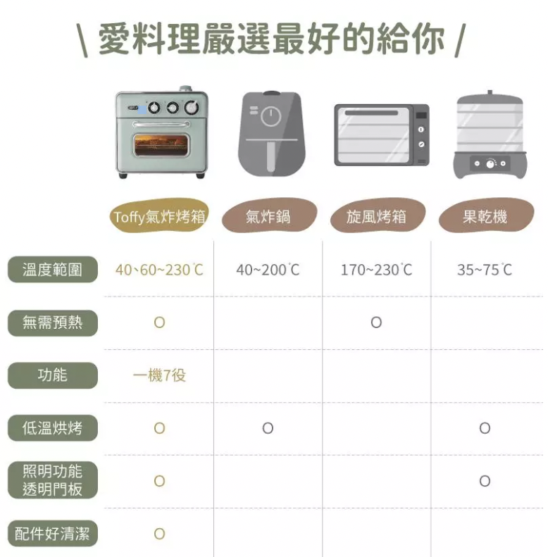 一機七種用途,擁有氣炸、烘烤、燒烤、慢烤、發酵等模式,烘烤溫度可自由調節,超廣範圍 40℃、60~230℃,定時可達 60 分鐘,還可搭配專屬烤網、烤架、烤盤等配件,不僅適合日常生活使用,也可做出各種甜點或料理!