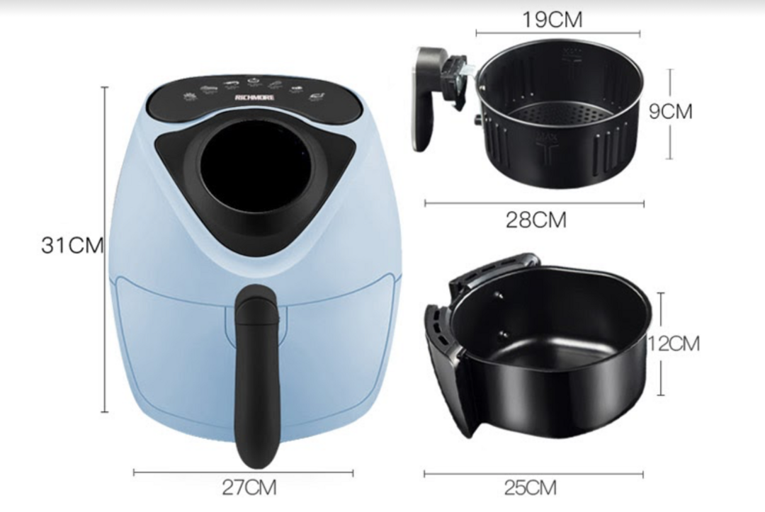 尺寸:氣炸鍋 W27 x D28 x H31cm/外鍋 W27 x D25 x H12cm/內鍋 W28 x D19 x H9cm