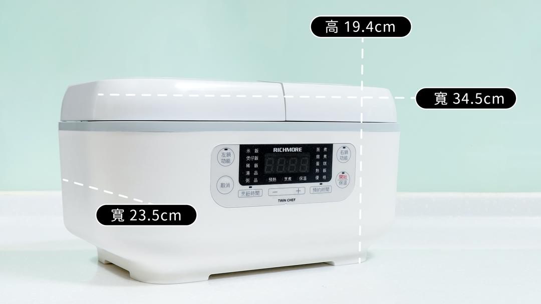 尺寸:電子鍋 W345 x D235 x H195 mm/內鍋 W150 x D170 x H100 mm/蒸盤 W132 x D154 x H46 mm