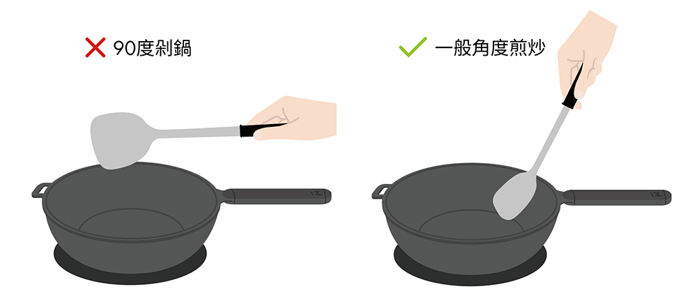 請勿於恰恰鍋面上剁切食物或是以鐵鏟用力重擊鍋面,避免造成鍋面損傷。