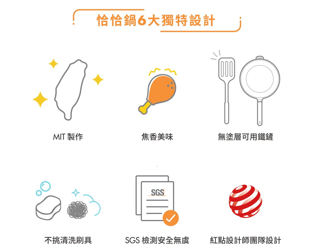 鍋身使用台灣獨家重力鑄壓工藝製成,受力平均,鍋緣均厚,導熱平均,不易發生中間熱、外側溫度不夠的狀況,因為恰恰鍋底部有聚熱紋設計,蓄熱力好,放進食材後不易產生降溫而出水導致食物炒不香的狀況,同步能達成不沾的效果。